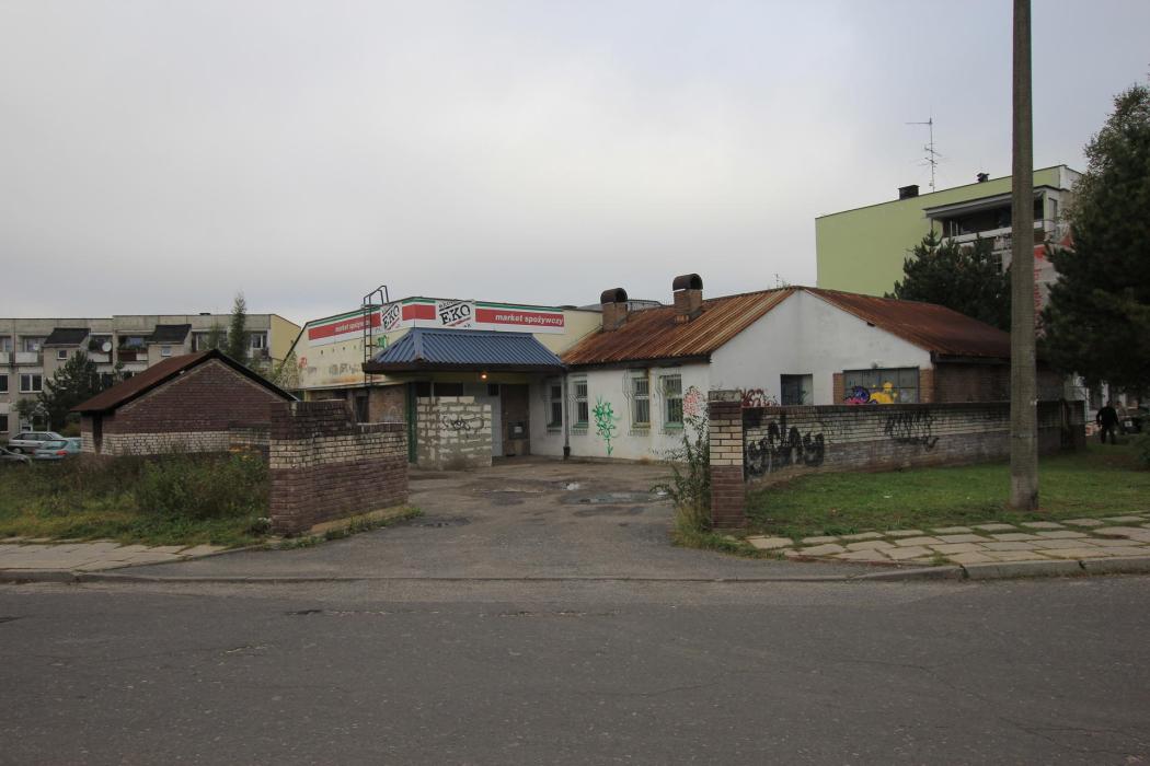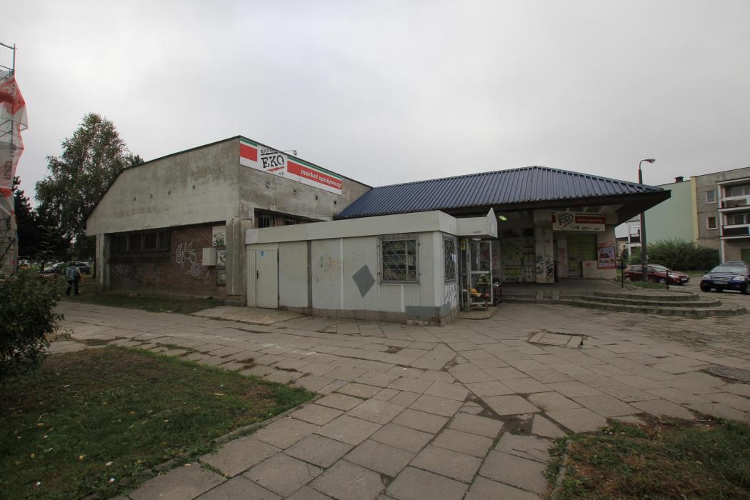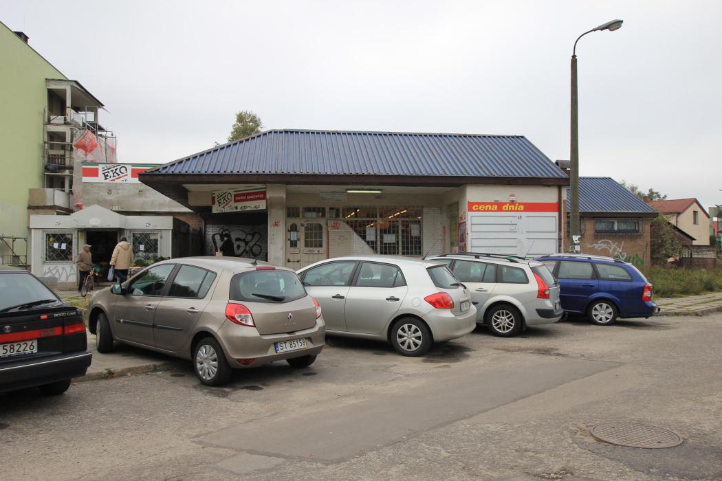 Widok pawilonu handlowego z ulicy Husarii Polskiej (miejsca parkingowe).